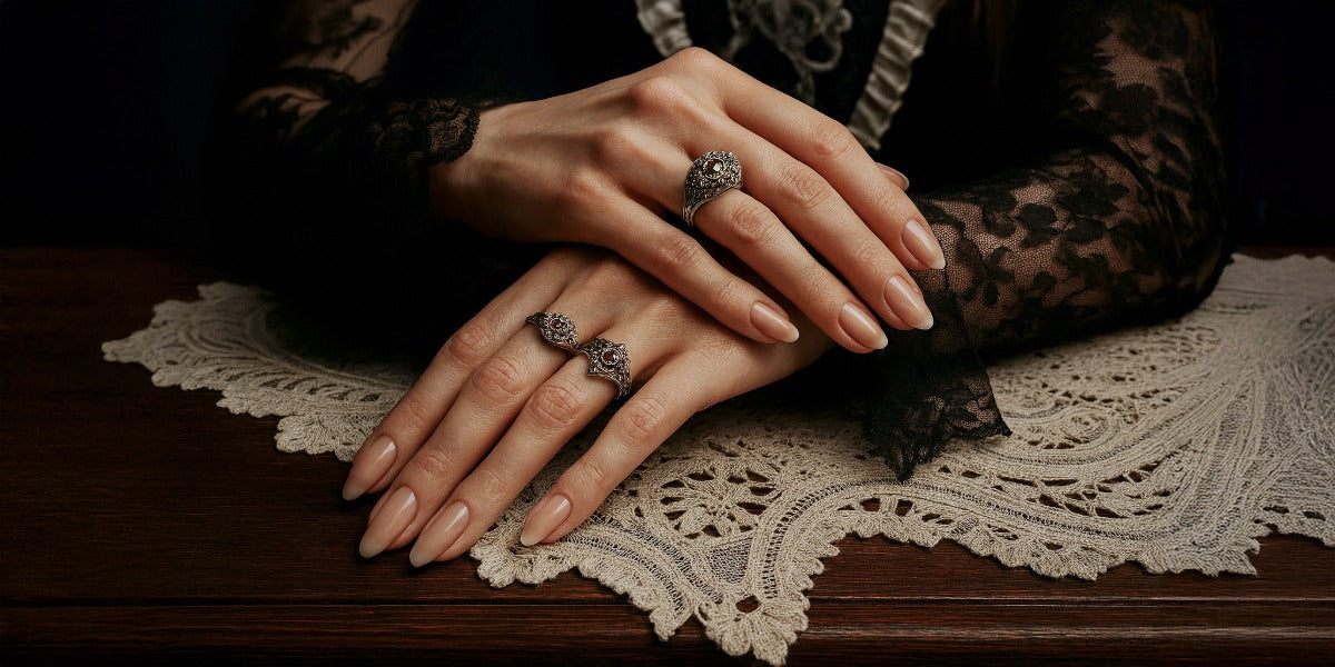 Ornate rings inspired by bygone courts and noble hands—each one a miniature story of elegance.