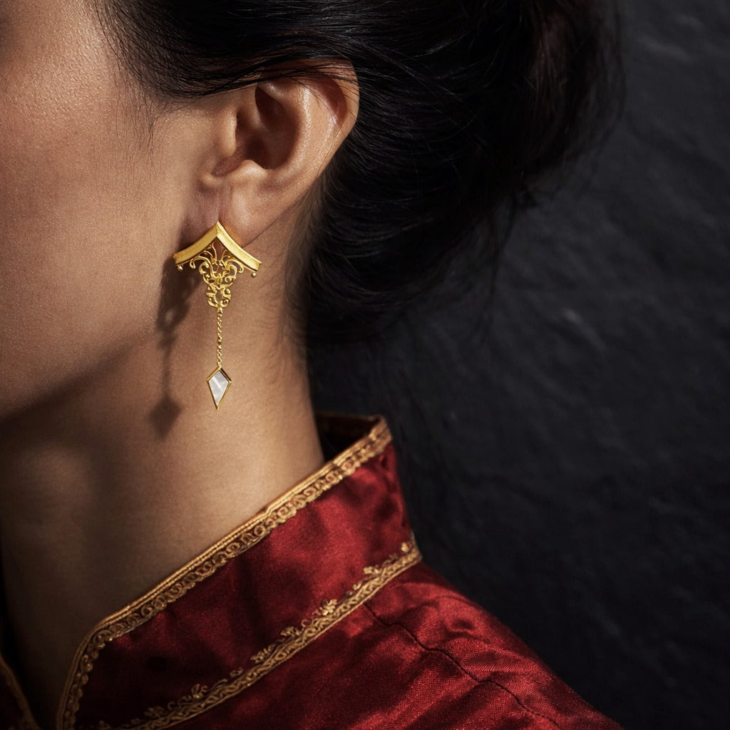 These drop earrings are made from 925 sterling silver and shaped with an architectural eave design inspired by traditional pagoda roofs. Each piece features a smooth mother of pearl section set into the structure, paired with fine openwork detailing and a slim drop element below.
