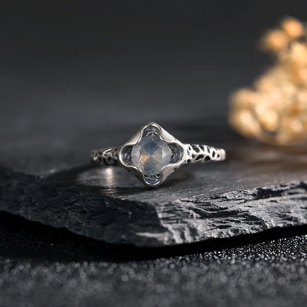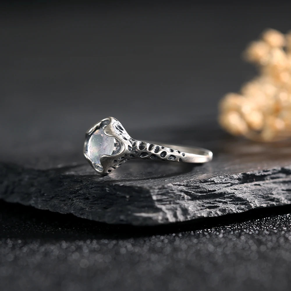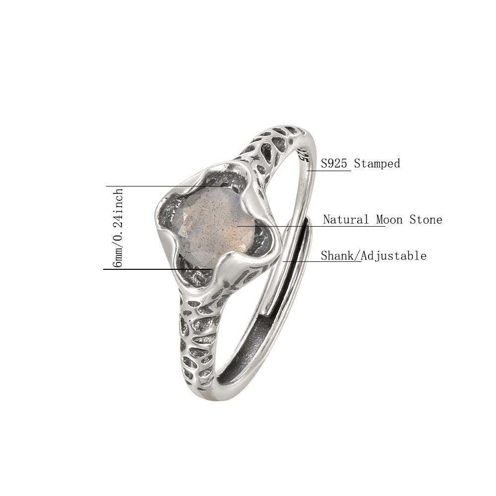 Women's S925 Sterling Silver Natural Moonstone Faceted Cut Gem Leopard Pattern Ring
