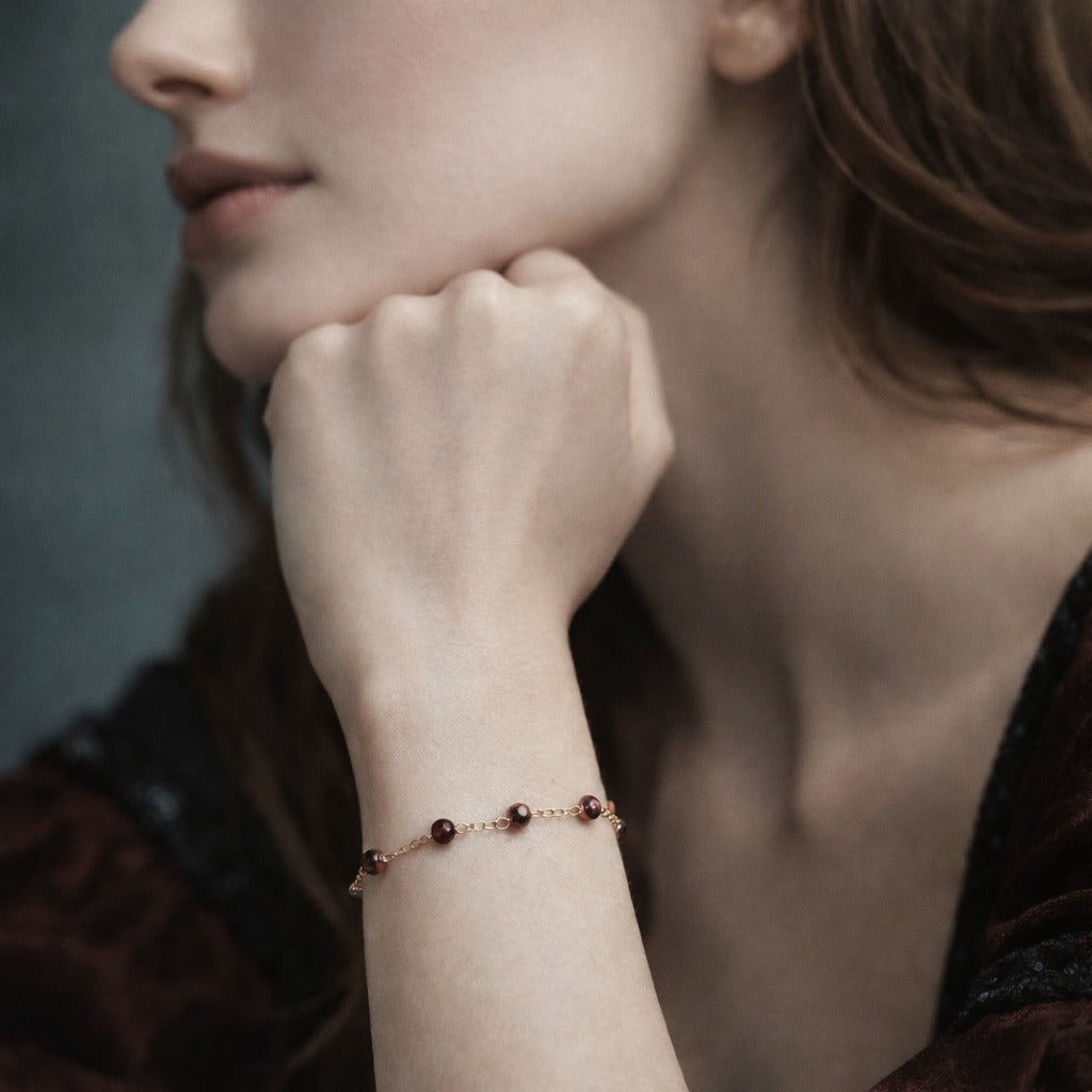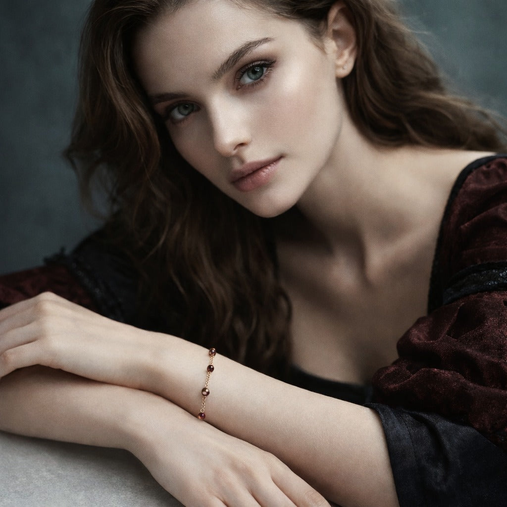 This sterling silver bracelet is designed for women who enjoy simple, elegant jewelry with a bit of color. The round red garnet beads are paired with a clean chain link design, giving the bracelet a balanced look that works well for everyday outfits and more polished occasions. The garnet adds a clear pop of red without being overwhelming, making it easy to match with both neutral and bold wardrobes.