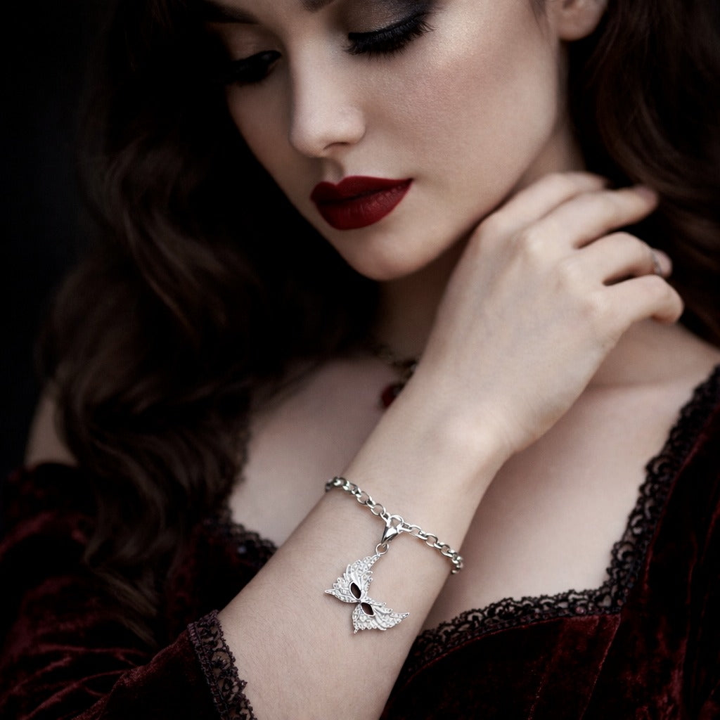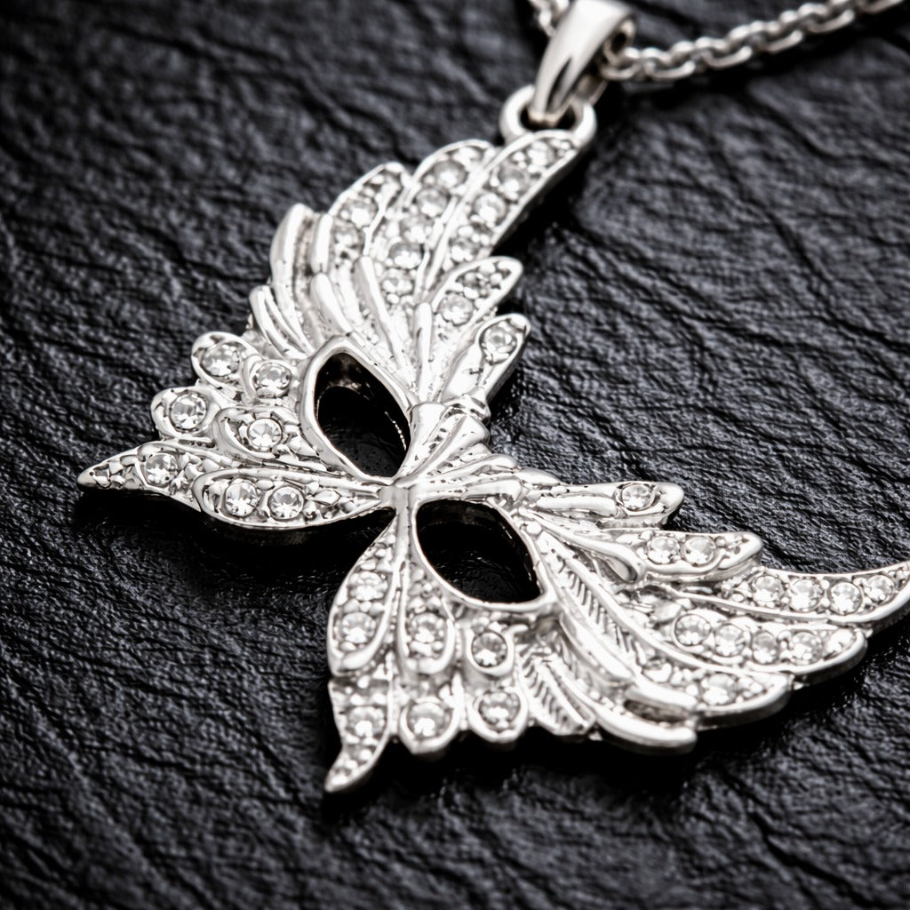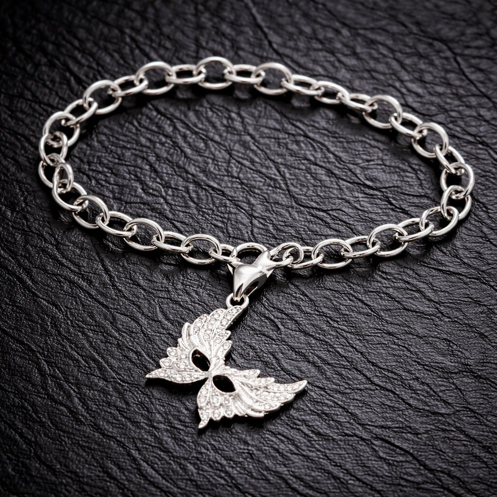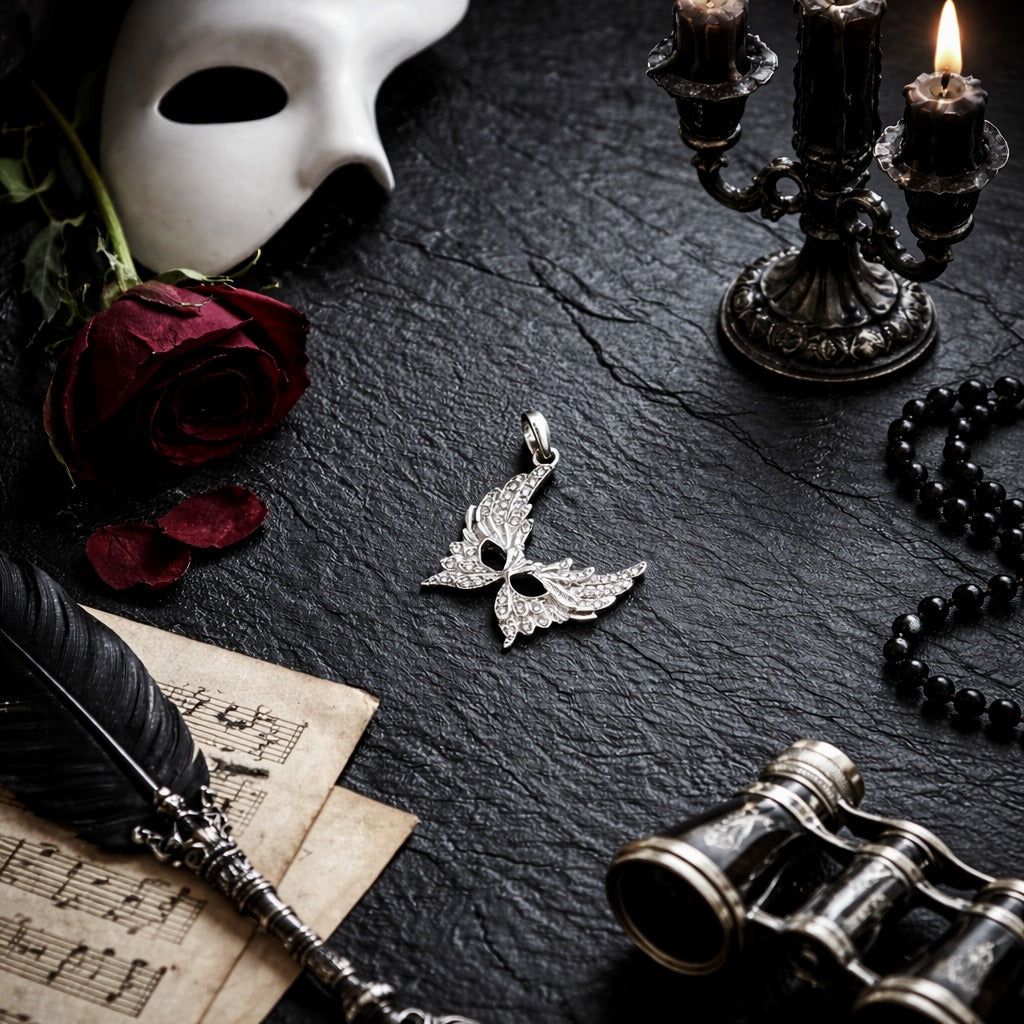 Inspired by Venetian masquerade tradition, this pendant charm features a feathered mask design detailed with shimmering zircon stones. Crafted from 925 sterling silver, the charm has a sculpted surface and refined sparkle that suits gothic, baroque, and masquerade jewelry styling. This listing is for the charm only. It can be paired with a chain for a necklace or added to a charm bracelet for versatile wear.