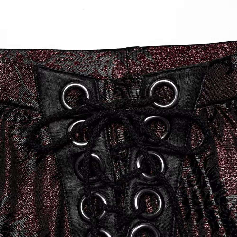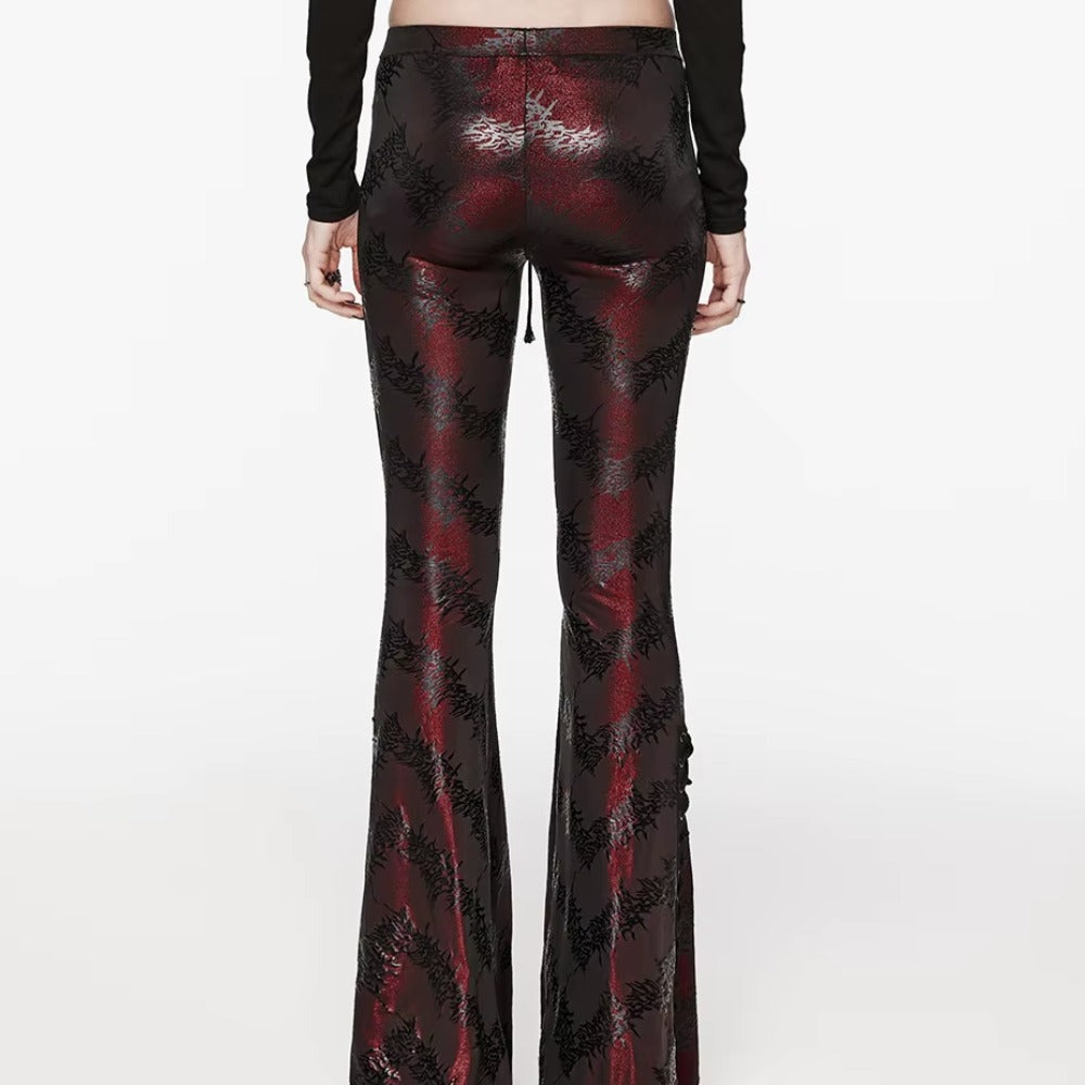 Women's Dark Red & Black Gothic Floral Jacquard Embroidered Metallic Lace-Up Flared Pants