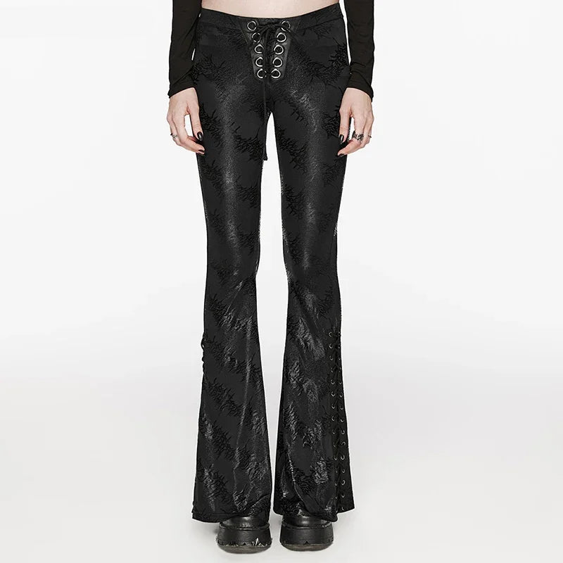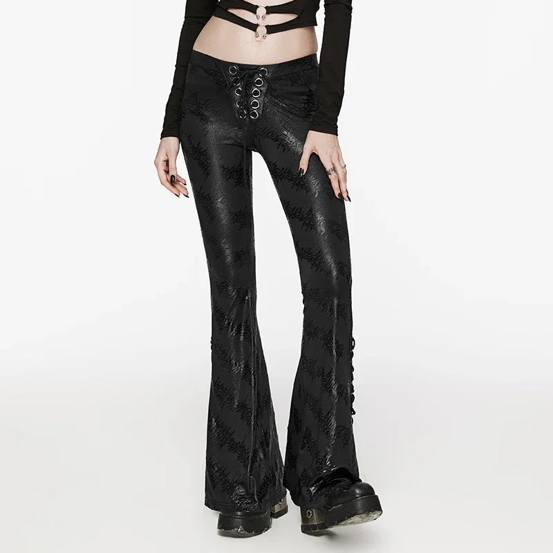 Command attention with these striking flared trousers, blending gothic edge and punk attitude in a sleek, body-hugging silhouette. Featuring dramatic lace-up accents, a low-waist fit, and a bold textured finish, they’re made for those who live to stand out—whether on stage, at a festival, or in everyday streetwear.