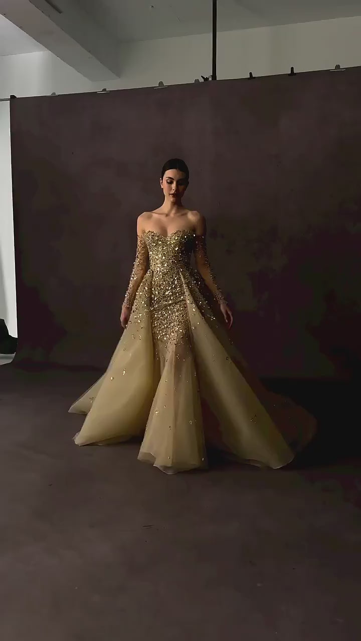 Golden Off-Shoulder Sequined Mermaid Wedding Gown with Detachable Overskirt