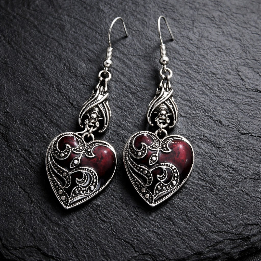 Embrace the darker side of elegance with these striking heart-shaped earrings. The deep crimson tone paired with silver bat accents gives them a bold, unmistakably gothic edge.