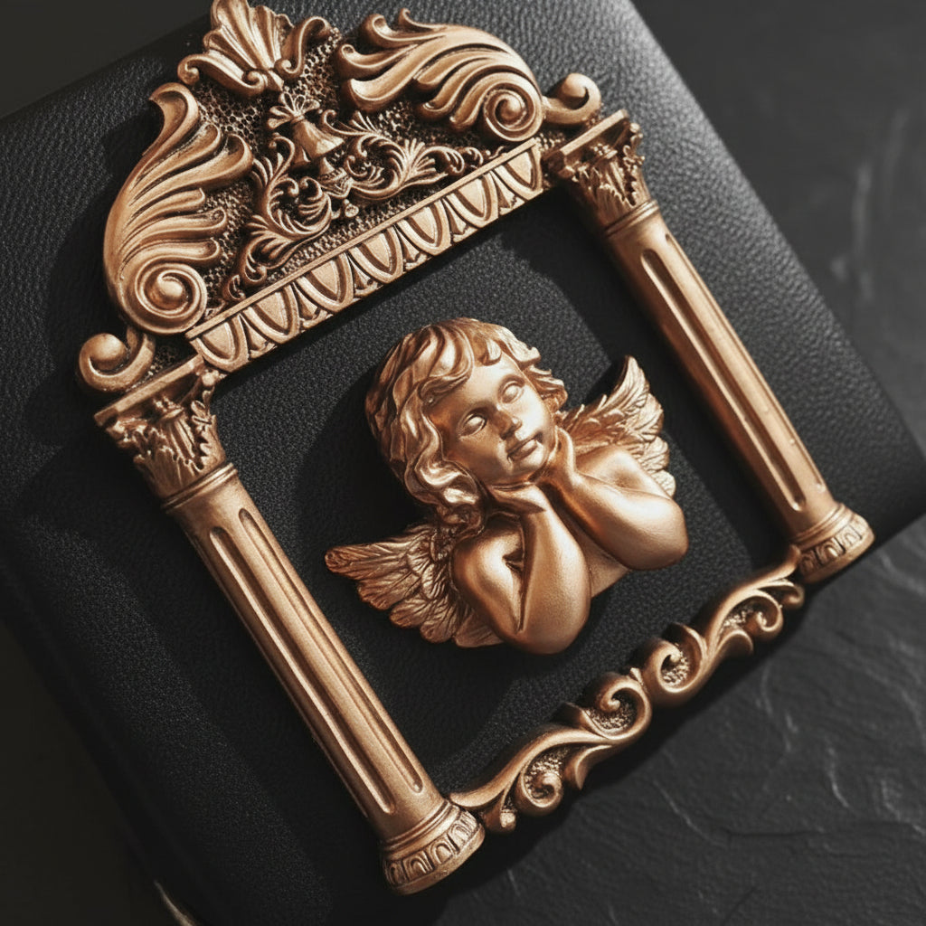 - Features a gold gilded Cupid angel framed in detailed baroque columns