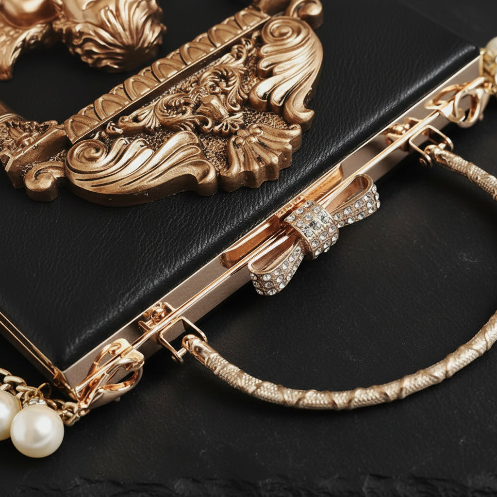 This structured evening bag blends classic baroque styling with a modern edge. The detailed gold Cupid centerpiece framed by ornate columns gives it a distinctive look, while the smooth faux leather finish keeps it polished and elegant. Complete with a metallic handle and pearl-accented chain strap, it’s made to stand out at any formal event without losing its timeless charm.