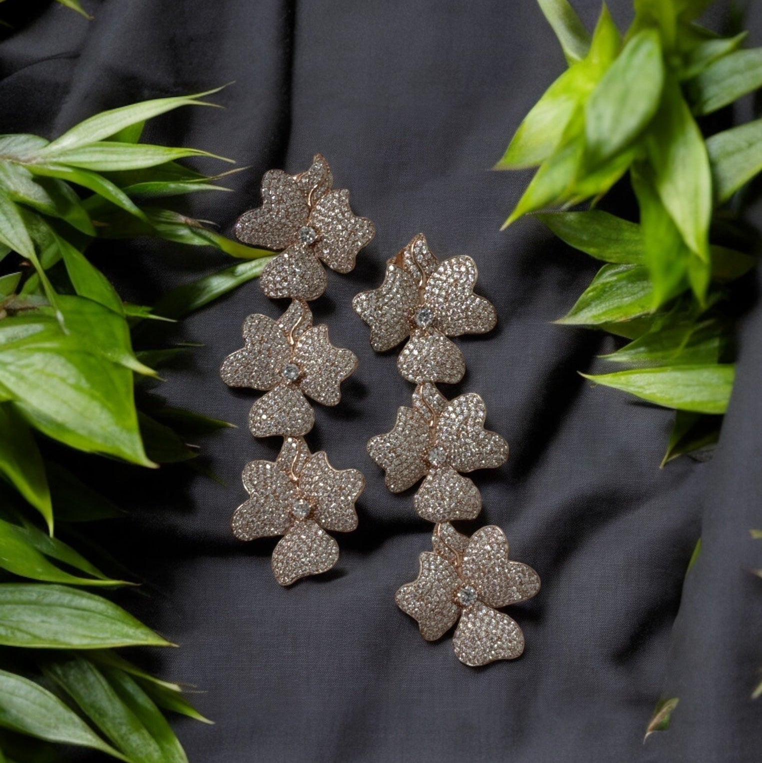 Luxury Rose Gold Triple Flower Cubic Zirconia & 925 Sterling Silver Women's Drop Earrings