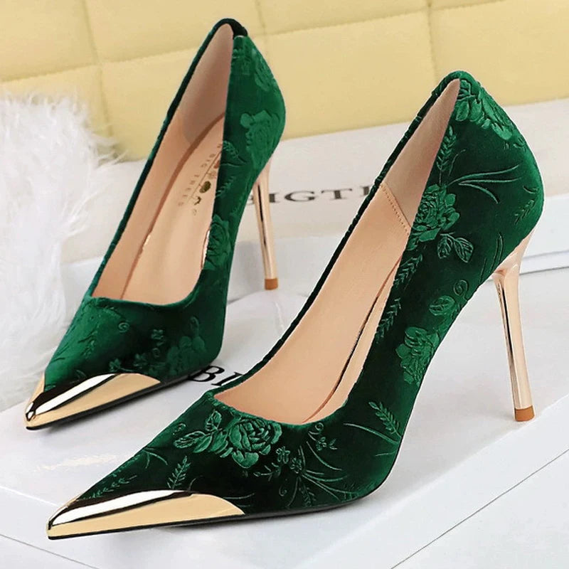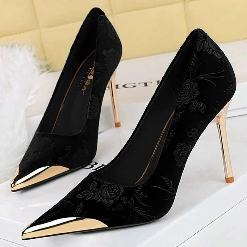 Luxury Women's Stiletto High Heels with Vintage Floral Embroidery & Metallic Pointed Toe