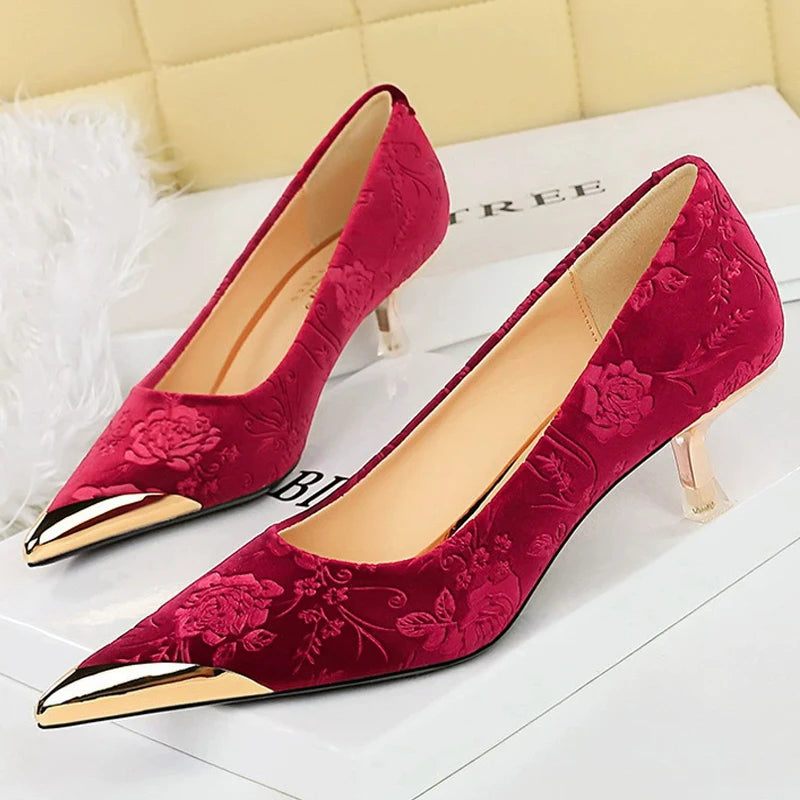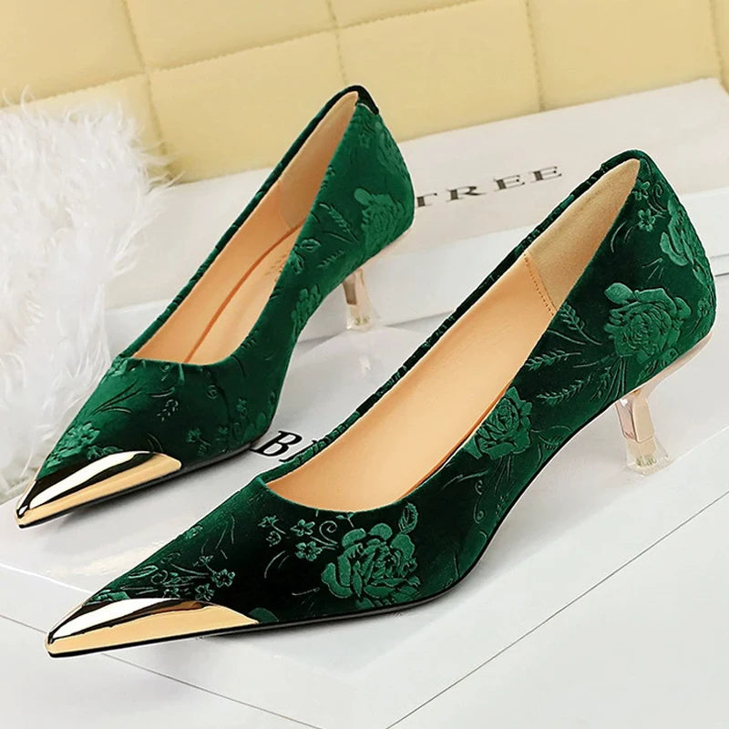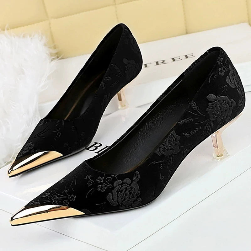Exquisite craftsmanship meets timeless sophistication in these high heeled pumps, designed for women who appreciate refined details. Featuring intricate floral embroidery, a sleek metallic pointed toe, and a graceful stiletto silhouette, they elevate any outfit from ordinary to unforgettable.