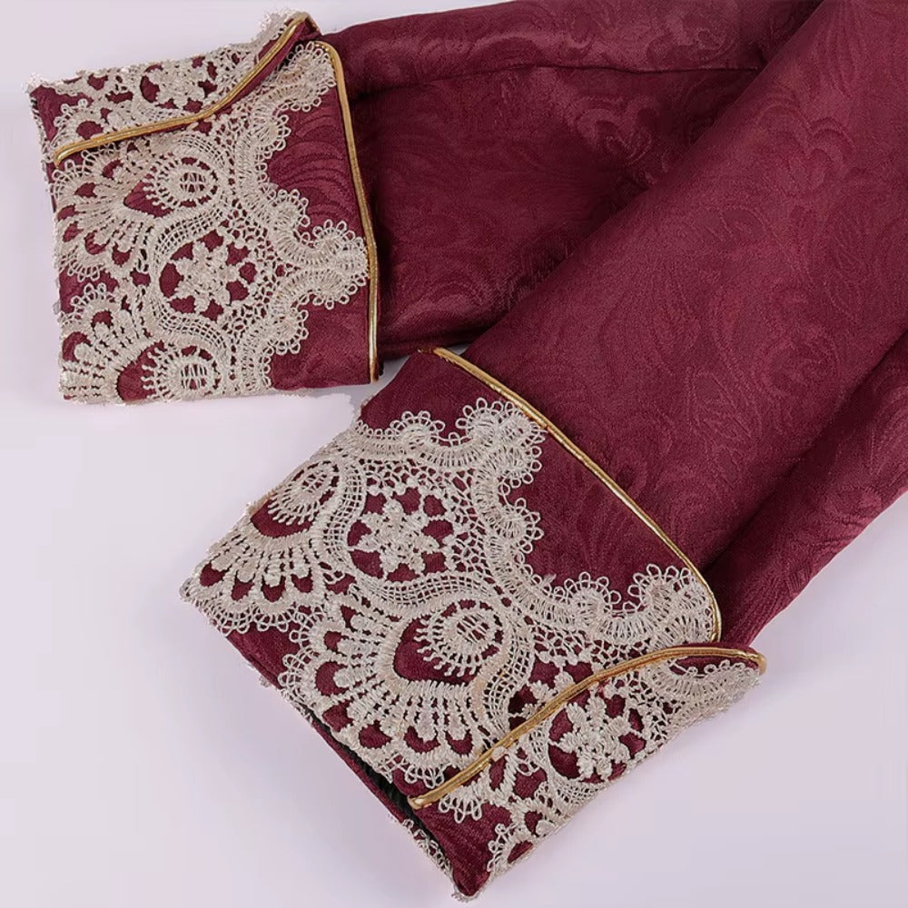 - Embroidery: intricate gold brocade pattern along lapels, cuffs, and front panels to evoke the opulent detail of 18th- and 19th-century court attire.