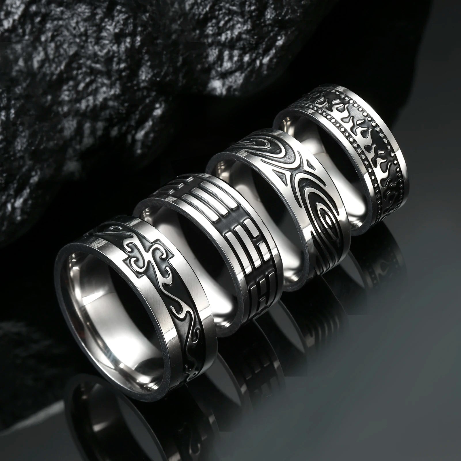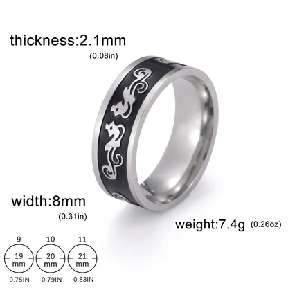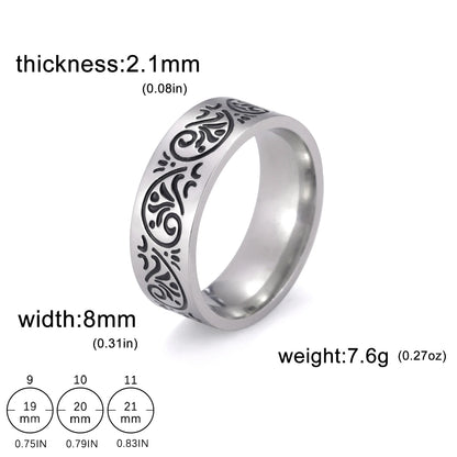 With its sleek stainless steel material and 8mm surface width, this ring is both durable and stylish. The geometric engraved pattern adds an extra element of interest to the design, making it a unique and eye-catching piece of jewelry. Available in different designs, this unisex ring is a versatile accessory that can be worn by anyone, making it a great addition to any jewelry collection.