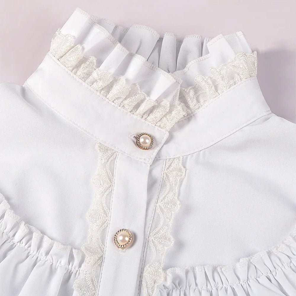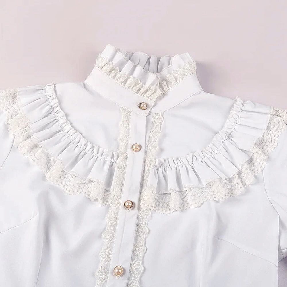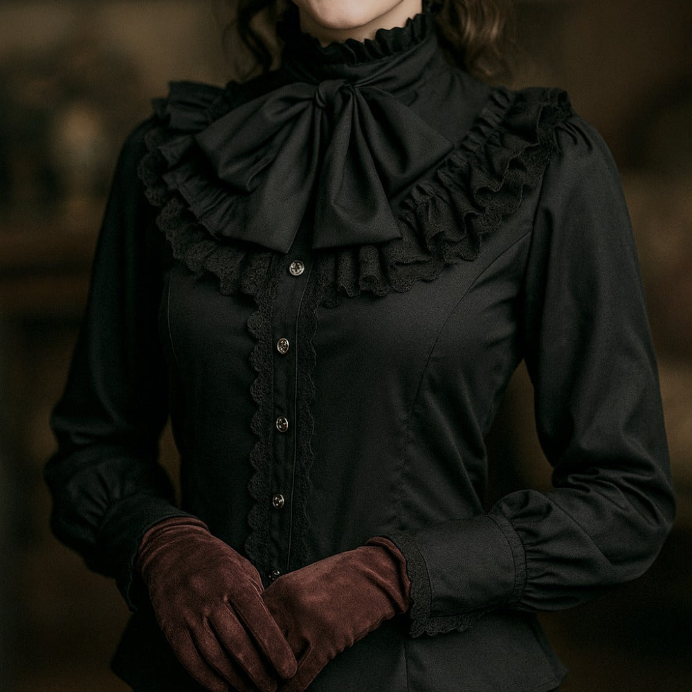 Elegance meets edge in this intricately designed blouse that channels Victorian romance with a gothic twist. The dramatic lotus ruffle neckline and flowing sleeves evoke a timeless silhouette, perfect for cosplay, historical reenactments, or alternative fashion styling. Crafted for comfort and visual impact, this piece blends vintage charm with modern versatility.