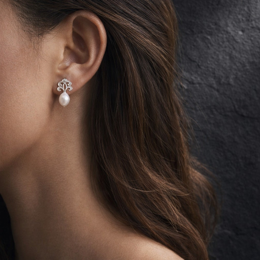 These earrings pair a soft teardrop pearl with an ornate gold toned silver setting shaped in a symmetrical, vintage inspired pattern. The upper section is detailed with gentle curves that frame the pearl rather than overpower it, giving the piece balance and structure. The pearl drop sits freely beneath the setting, adding subtle movement without feeling loose or fragile. Gold toned silver brings warmth to the design while keeping it light enough for regular wear.