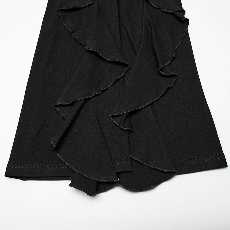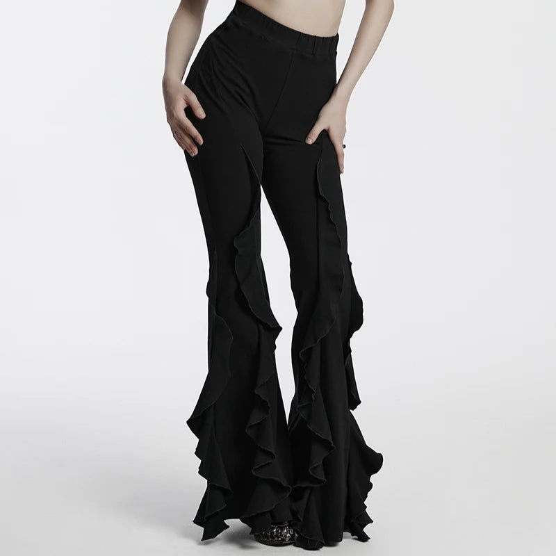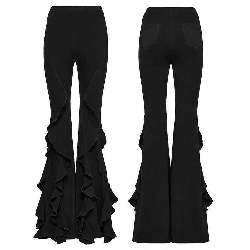 Command attention with these statement making gothic flare pants, designed for those who live and breathe alternative style. The dramatic ruffled fishtail legs create a striking silhouette, while the high waist fit and micro elastic fabric sculpt and flatter. Perfect for gothic streetwear, cosplay events, concerts, or simply making every day feel like a runway.