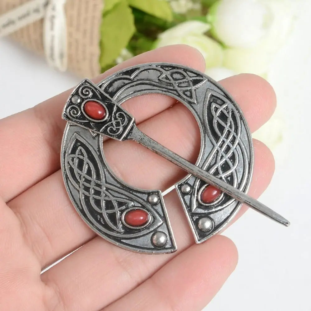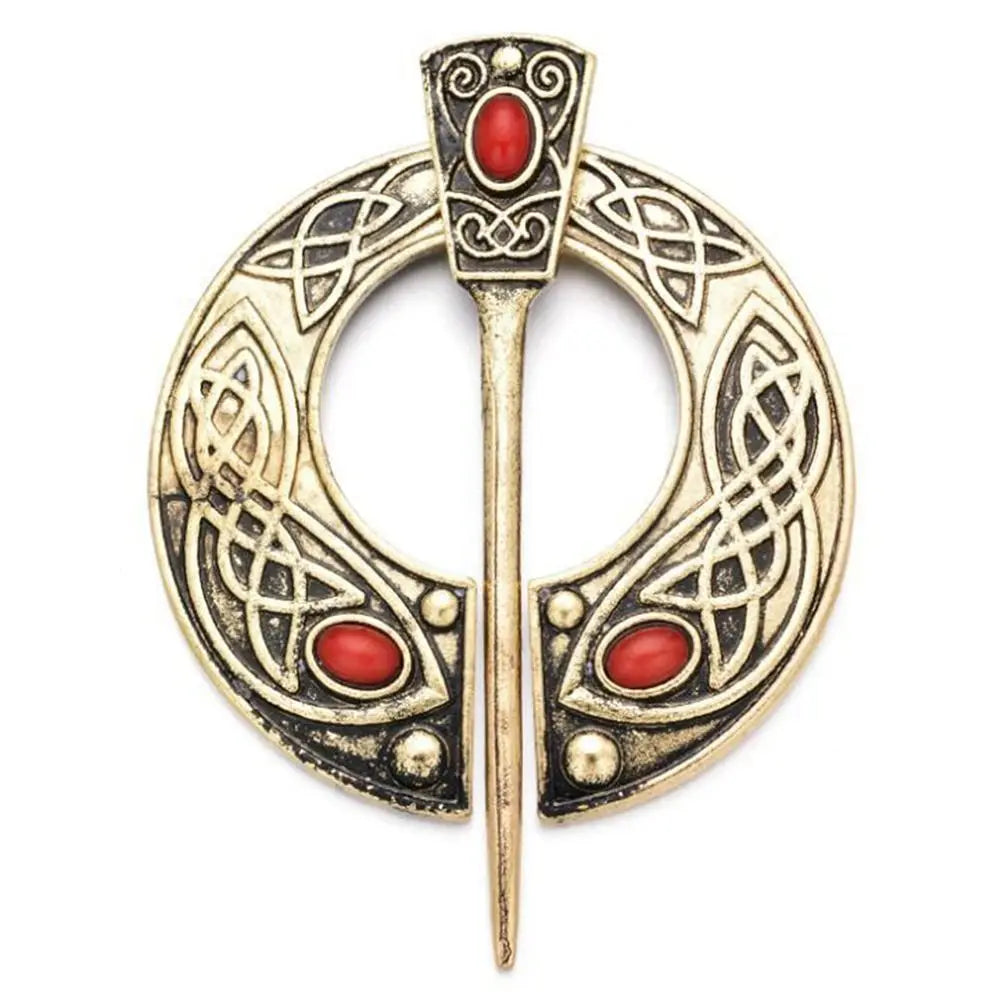Steeped in the artistry of the Viking and Celtic eras, this ornate cloak brooch blends historical authenticity with timeless elegance. The intricate knotwork design, accented with deep red gemstones, secures cloaks, shawls, or capes while adding a striking focal point to any medieval, renaissance, or fantasy ensemble. Perfect for reenactments, cosplay, or collectors who value craftsmanship and heritage detail.