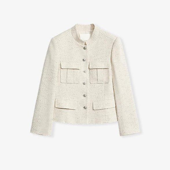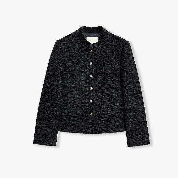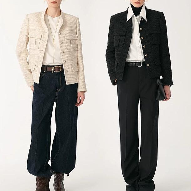 Women's Woolen Blend Tweed Cropped Blazer Jacket with Stand Collar